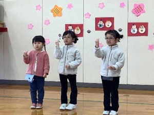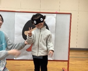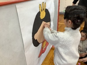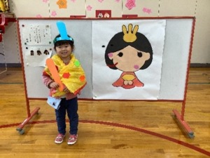 ひなまつり会では、はじめに、「♪うれしいひなまつり」を大きな声で歌い、次にゲーム「おひなさま福笑い、おだいりさま変身ゲーム」をしました。自分で完成させたお雛様と一緒にお内裏様に変身して、ポーズを決めて写真を撮りました。