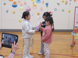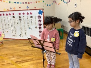 年長さんは、「上手にできるようになったこと」の発表をしました。鍵盤ハーモニカでの「むすんでひらいて」、縄跳びの前跳びを披露し、なんと最高記録も達成!最後には、心を込めた「ありがとうさようなら」の歌を堂々と披露しました。